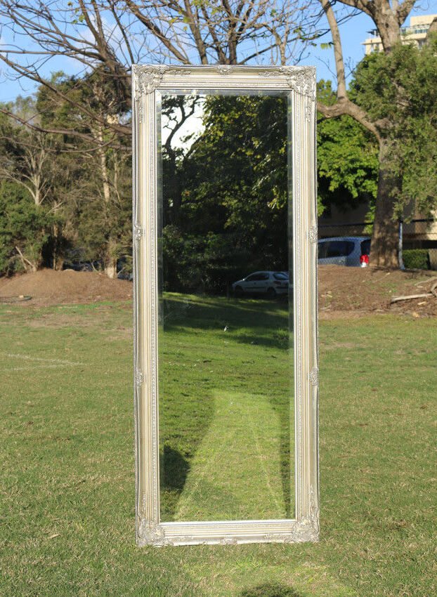 This large full length mirror adds depth and dimension to any room. With silver floral accents and bevelled frame, this mirror is perfect for hallways, dressing rooms, living rooms and more!